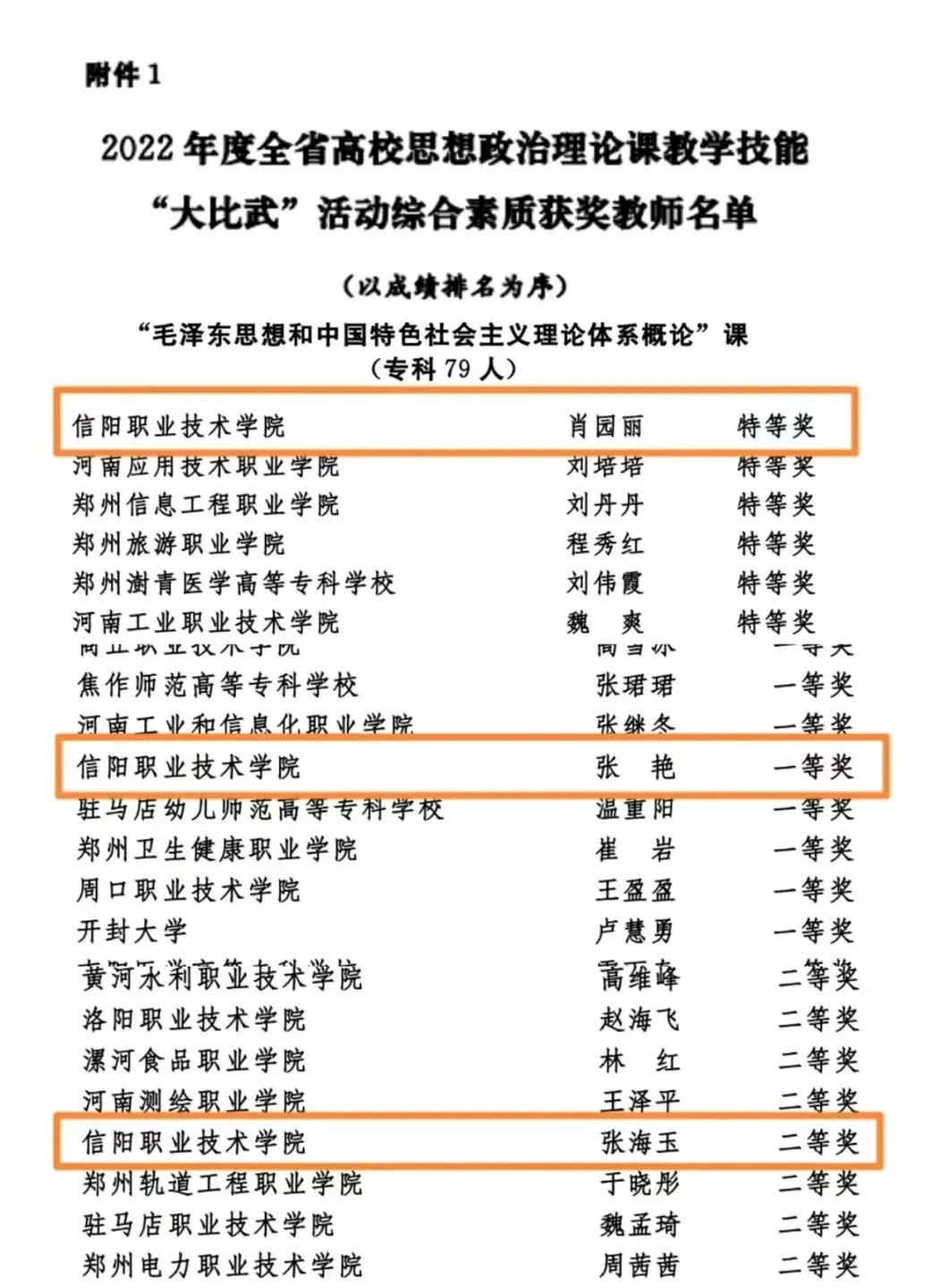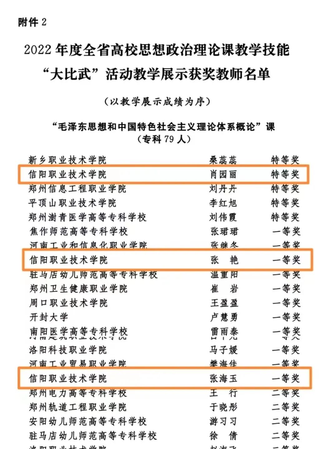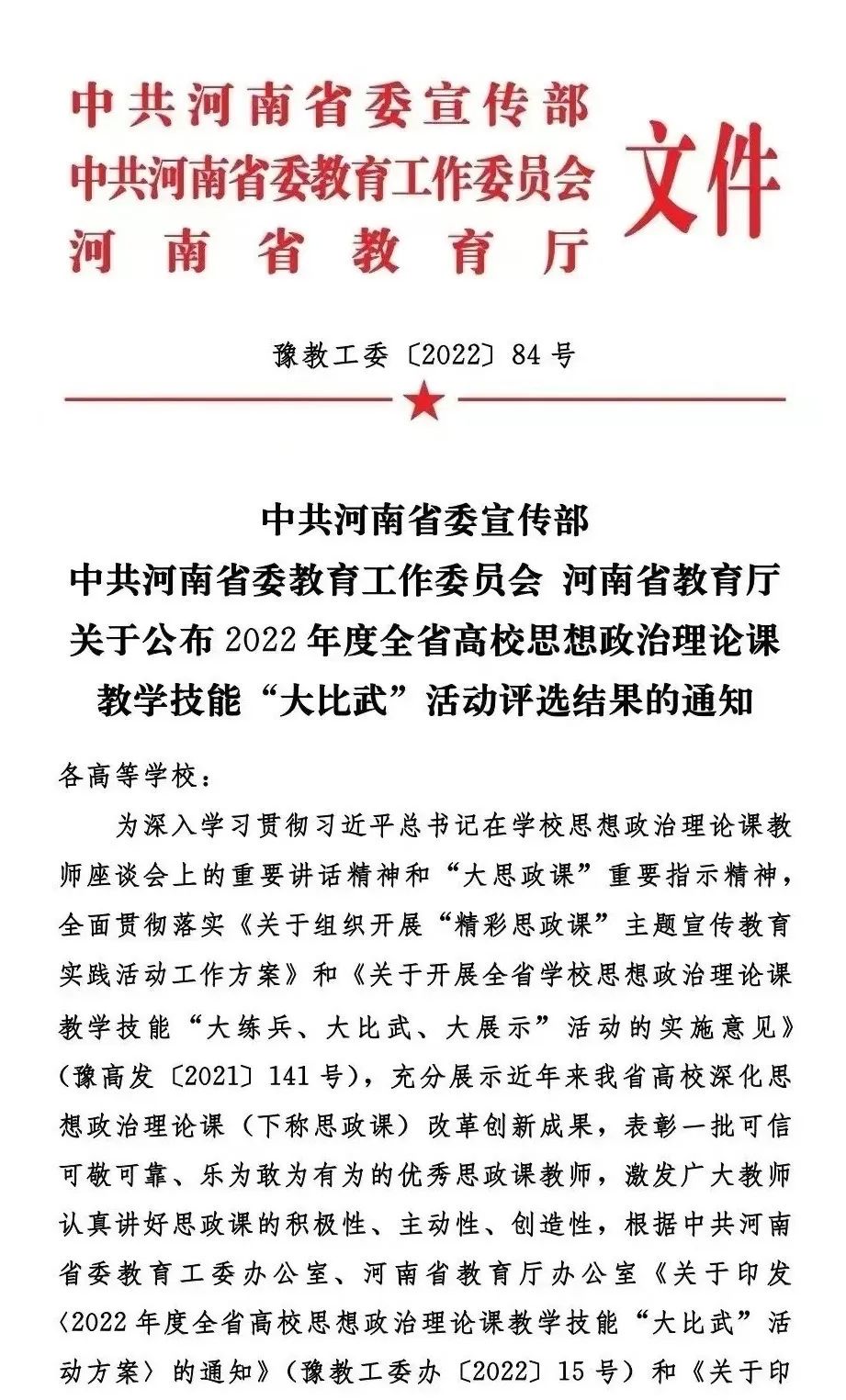 近日,2022年度河南省高校思想政治理论课教学技能“大比武”活动评选结果公布,我校beat365亚洲版官方网站教师在活动中取得优异成绩。其中,肖园丽老师荣获“毛泽东思想和中国特色社会主义理论体系概论”课综合素质和活动展示特等奖;张艳老师荣获“形势与政策”课综合素质和活动展示一等奖;张海玉老师荣获“思想道德与法治”课综合素质二等奖和活动展示一等奖,充分展现了我校思政课教师扎实的理论功底和高超的教学技能。