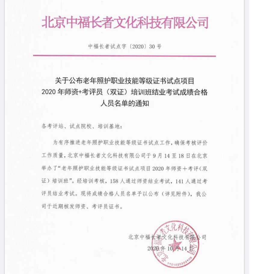 9月13日—18日,开云kaiyun登录入口四名教师参加了由中国社会福利与养老服务协会、北京中福长者文化科技有限公司举办的“教育部1+X老年照护职业技能等级证书试点项目2020年师资+考评员(双证)培训班”。培训过程中老师们认真准备,经过紧张激烈的角逐,范轶、齐宁、刘玉华、祁首鸣四位老师通过考试,获得了“师资+考评员”双资格,为开云官网老年健康管理专业深化教育教学改革、优化课程体系,加强复合型技术技能人才培养等方面做好知识储备,同时进一步加强校企合作,培养更多贴近企业实际需求的技能人才,更好地促进学生就业。
