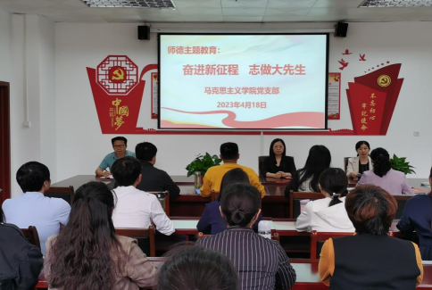 为深入学习贯彻党的二十大精神,提升新时代思政课教师队伍的思想政治素质和师德修养,4月18日下午,beat365亚洲版官方网站党支部在会议室召开了“奋进新征程,志做大先生”师德主题教育动员会。党支部书记郑玉秀主持会议,全体教师参会。