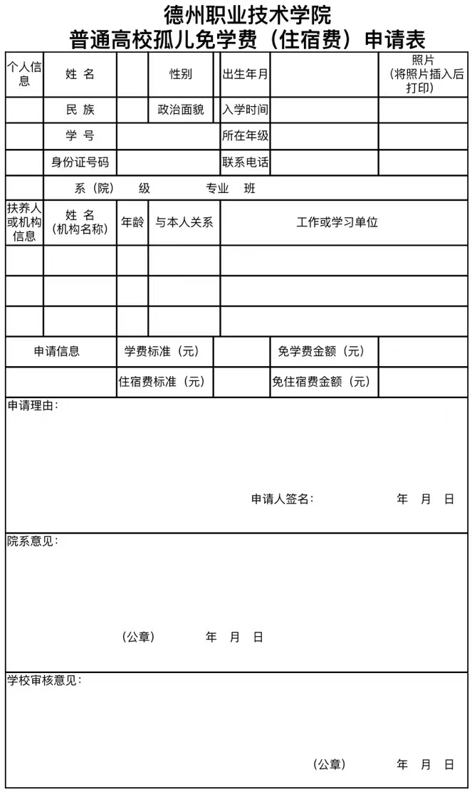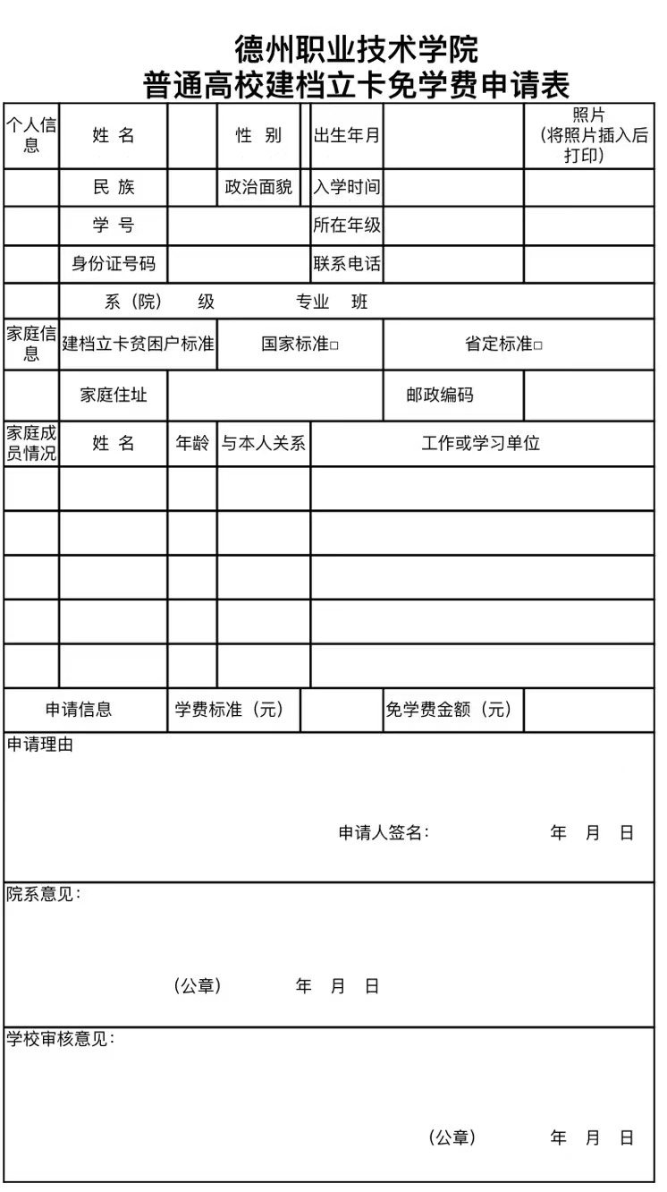 在了解资助政策的基础上,要充分尊重个人意愿,遵循自愿申请的原则,符合条件的学生填写“普通高校建档立卡免学费申请表”或“普通高校孤儿免学费申请表”。(见附件)