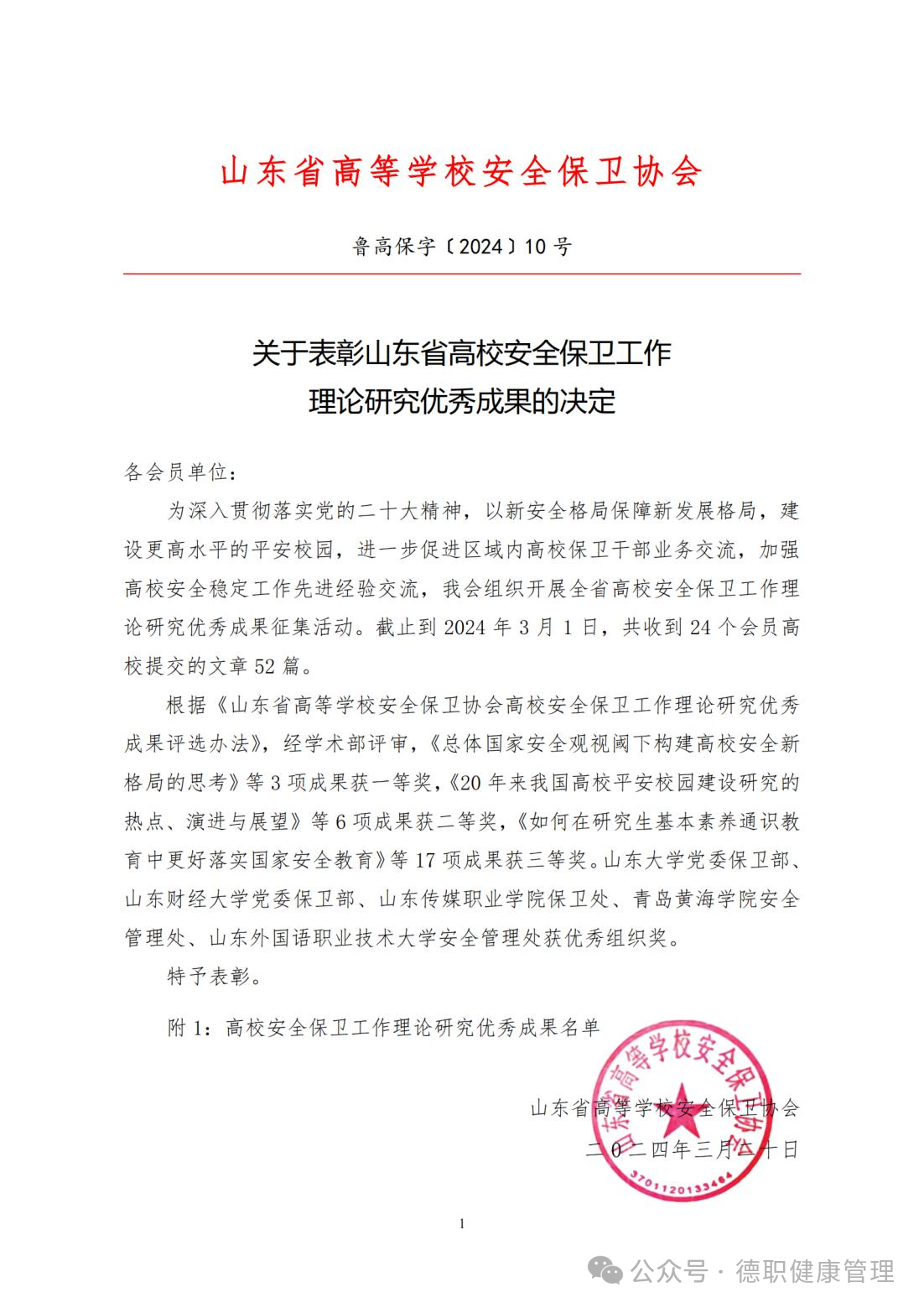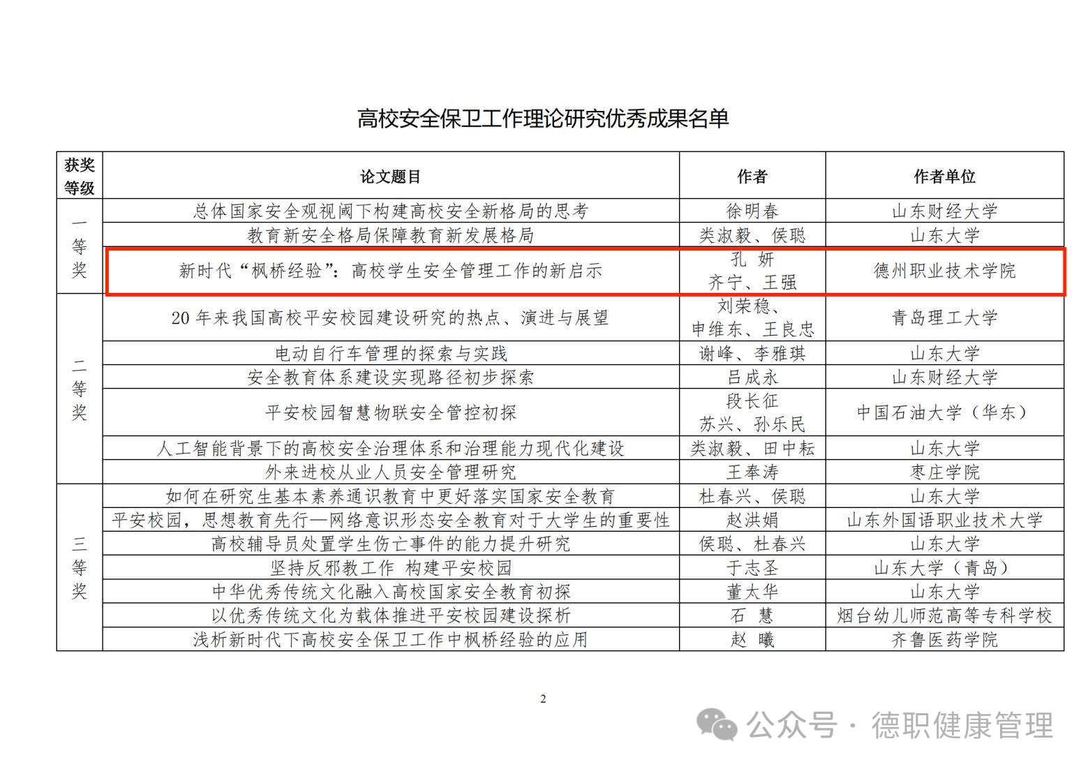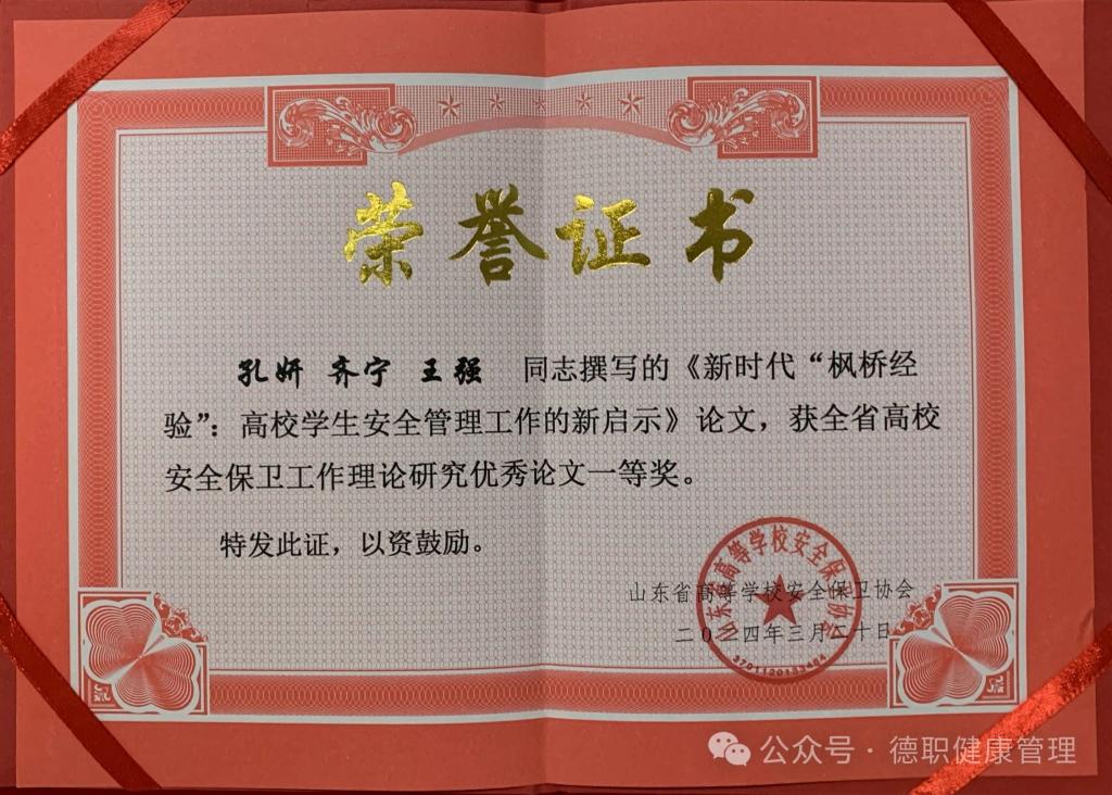 近日,山东省高等学校安全保卫协会公布了《关于表彰山东省安全保卫工作理论研究优秀成果的决定》,开云官网“护航成长”辅导员工作室成员孔妍、齐宁、王强同志撰写的论文《新时代“枫桥经验”:高校学生安全管理工作的新启示》脱颖而出,荣获一等奖,是唯一荣获一等奖的高职院校。