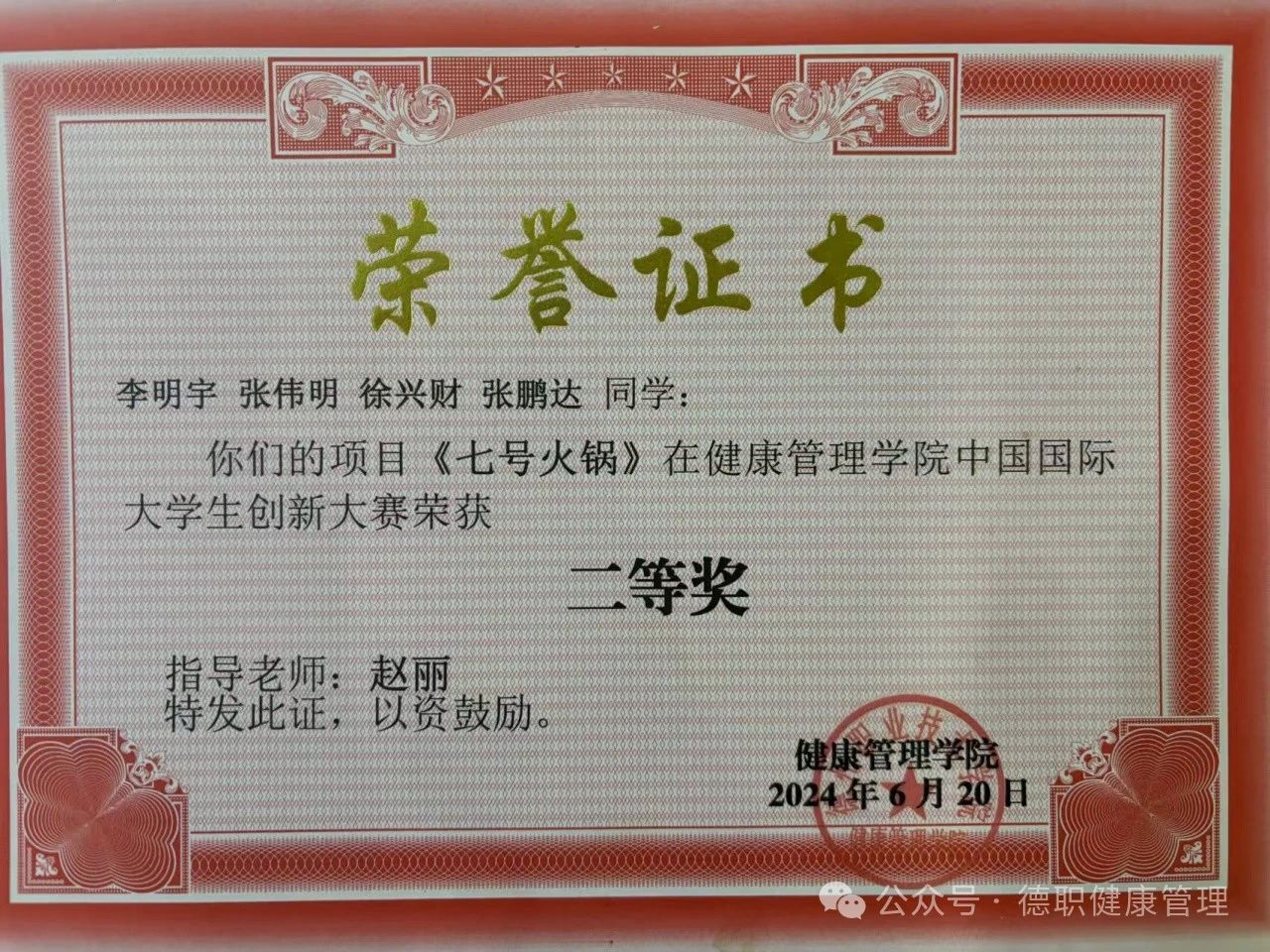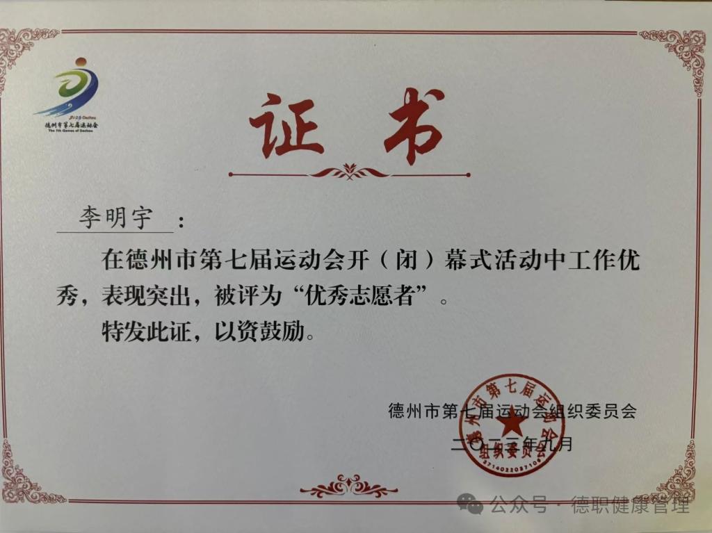 2023年9月在德州市第七届运动会开闭幕式中,工作优秀,表现突出,被评为“优秀青年志愿者”。