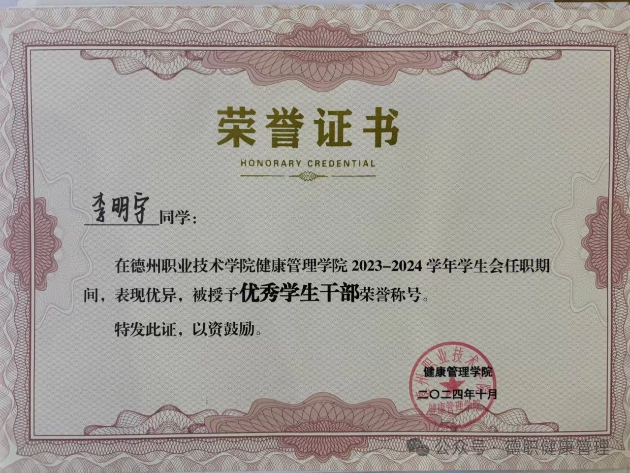 2024年10月在开云kaiyun登录入口2023—2024学年学生会任职期间,表现优异,被授予优秀学生干部称号。