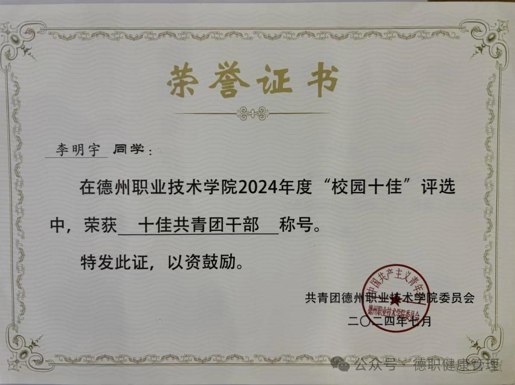 2024年7月在开云kaiyun登录入口2024年度“校园十佳”评选中,荣获十佳共青团干部称号。