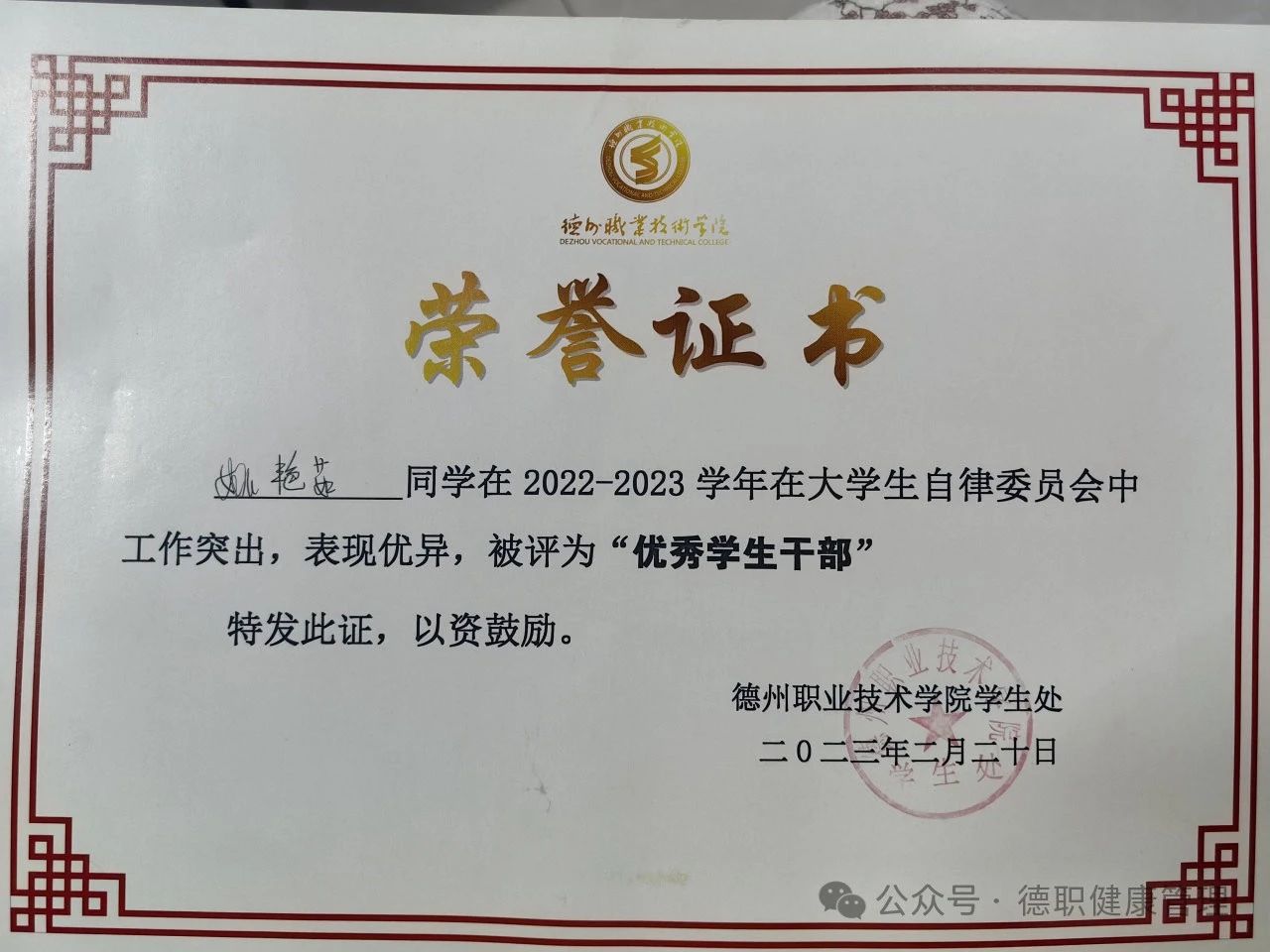 2023年2月在开云kaiyun登录入口大学生自律委员会任职期间被评为“优秀学生干部”。