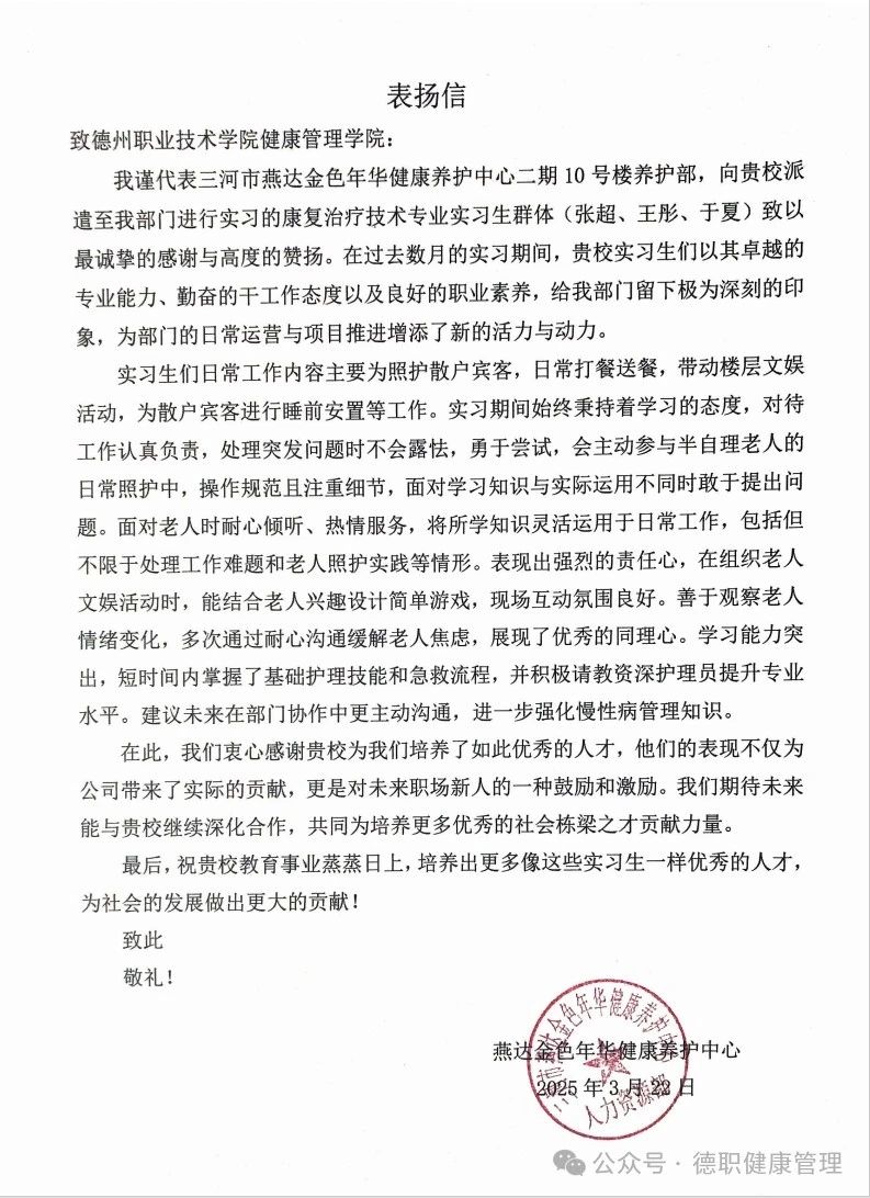 近日,三河市燕达金色年华健康养护中心向开云官网发来表扬信,信中对22级康复治疗技术专业学生张超、王彤、于夏在实习期间展现出的专业素养和敬业精神给予高度评价。