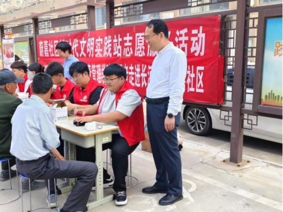 学生志愿者们为社区老人们测血压、测血糖,耐心与老人们交流,并向他们讲解健康保健知识。针对出现“三高”症状的居民给予注意饮食、合理作息、遵照医嘱,正确服药的提醒。