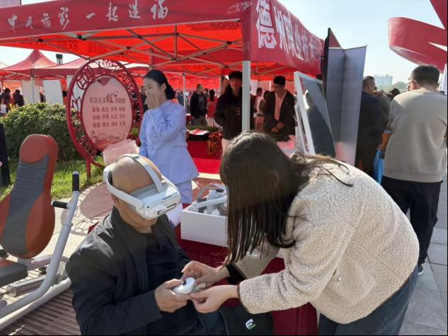 市民体验VR虚拟眼镜,刘敏老师现场指导。该设备内含养老照护虚拟仿真资源,为体验者提供虚拟的养老照护场景,身临其境地学习养老照护相关知识。