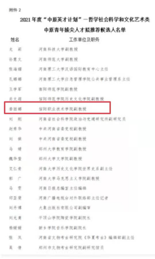 根据省人才工作领导小组办公室《关于开展2021年度“中原英才计划(育才系列)”申报工作的通知》(豫人才办〔2021〕1号)精神和省委宣传部《关于印发<2021 年度“中原英才计划”—中原文化名家申报指南>的通知》《关于印发<2021 年度“中原英才计划”—中原青年拔尖人才(哲学社会科学和文化艺术类)申报指南>的通知》要求,经过个人申请、单位审核推荐,省委宣传部组织专家组进行评审,拟推荐河南财经政法大学方雪琴等11名同志为中原文化名家候选人,河南科技大学尤莉等21名同志为哲学社会科学和文化艺术类中原青年拔尖人才候选人,现予以公示(名单详见附件)。beat365娄丽娜老师拟推荐为哲学社会科学和文化艺术类中原青年拔尖人才候选人。(通讯员 娄丽娜)