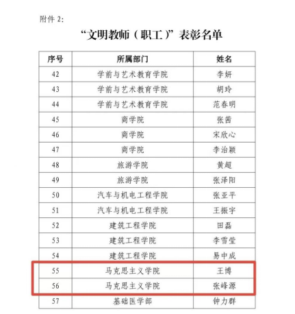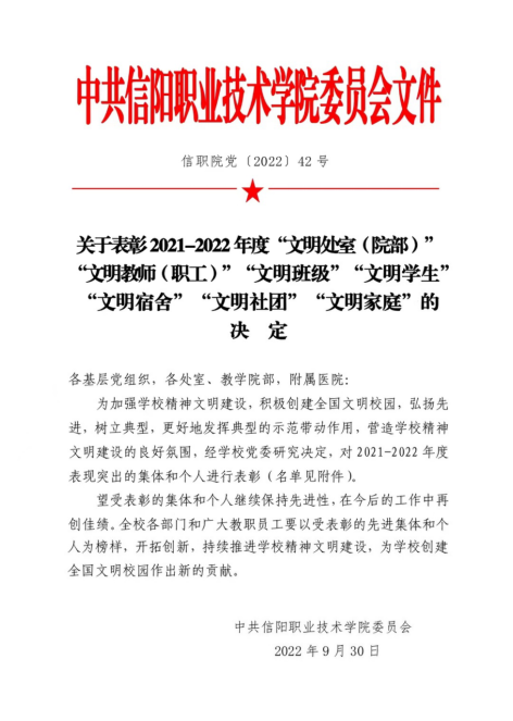 2022年9月30日,中共beat365亚洲版官方网站 印发 《关于表彰2021-2022年度“文明处室(院部)”“文明教师(职工)”“文明班级”“文明学生”“文明宿舍”“文明社团”“文明家庭”的决定》,2021-2022年度表现突出的集体和个人进行表彰 beat365亚洲版官方网站青年教师王博 、张峰源 被评为文明教师,司楠教师家庭被评为文明家庭
