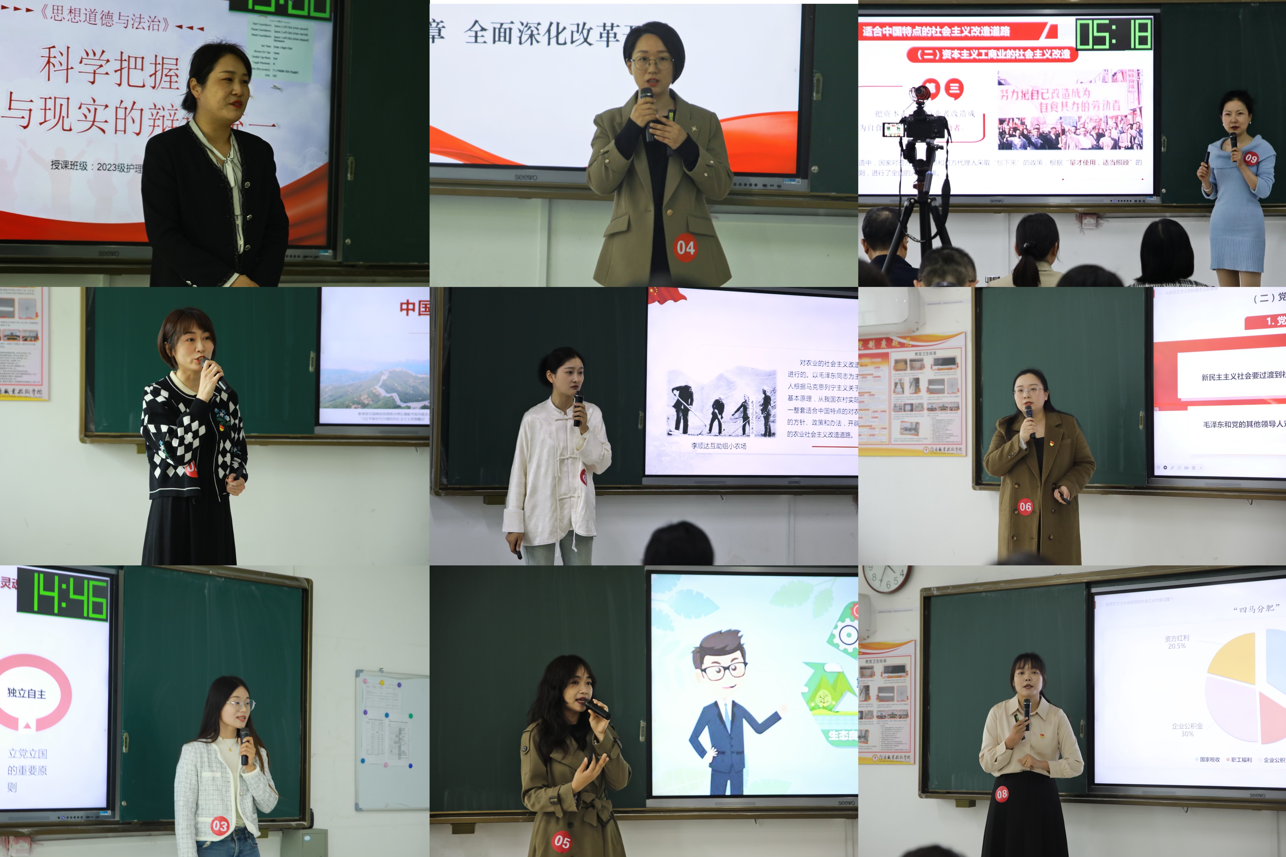活动环节,经过beat365亚洲版官方网站初赛遴选出的9名选手,围绕《习近平新时代中国特色社会主义思想概论》《毛泽东思想和中国特色社会主义理论体系概论》《思想道德与法治》《形势与政策》四门课程,按照抽签的先后顺序,结合PPT,进行了15分钟的现场无生教学展示。选手们用饱满的热情、创新的设计、详实的讲解,充分展示出深厚的理论功底和扎实的教学技能。