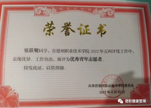 人生三学,学而无厌,学无止境,学以致用。在大一期间综合测评与期末成绩均居本班第一,积极参与技能大赛,获得山东省技能兴鲁职业技能大赛健康管理项目一等奖,德州市技能兴德职业技能大赛健康管理项目一等奖,张跃骜不仅自己成绩优秀还积极带动同学学习,组织了期末数学突击小组并担任主讲。